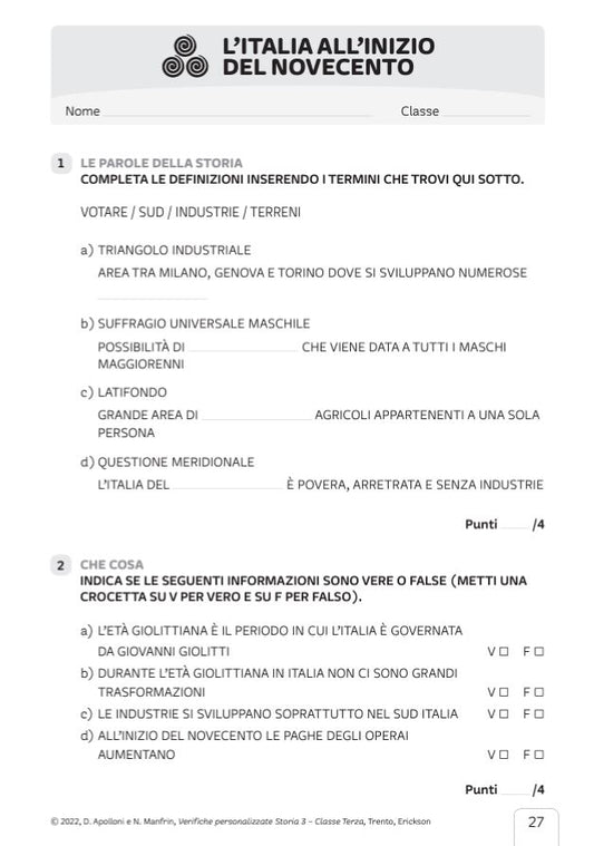 Verifiche personalizzate - Classe terza: Italiano, storia, geografia