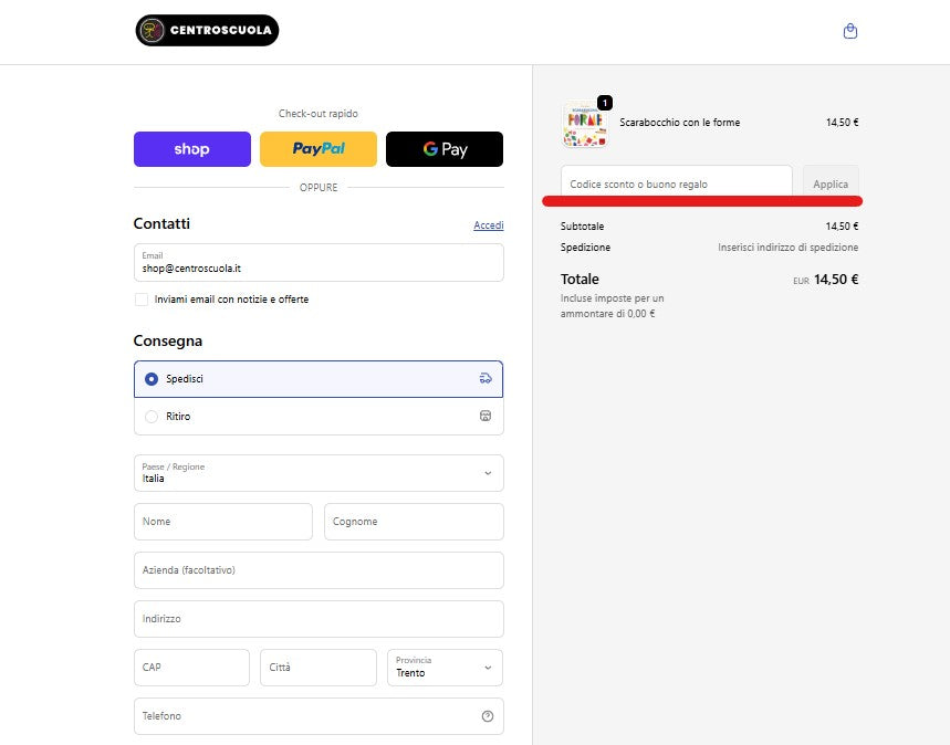Vai al Check-out e inserisci il codice Carta del Docente nel campo 'Codice sconto o buono regalo'