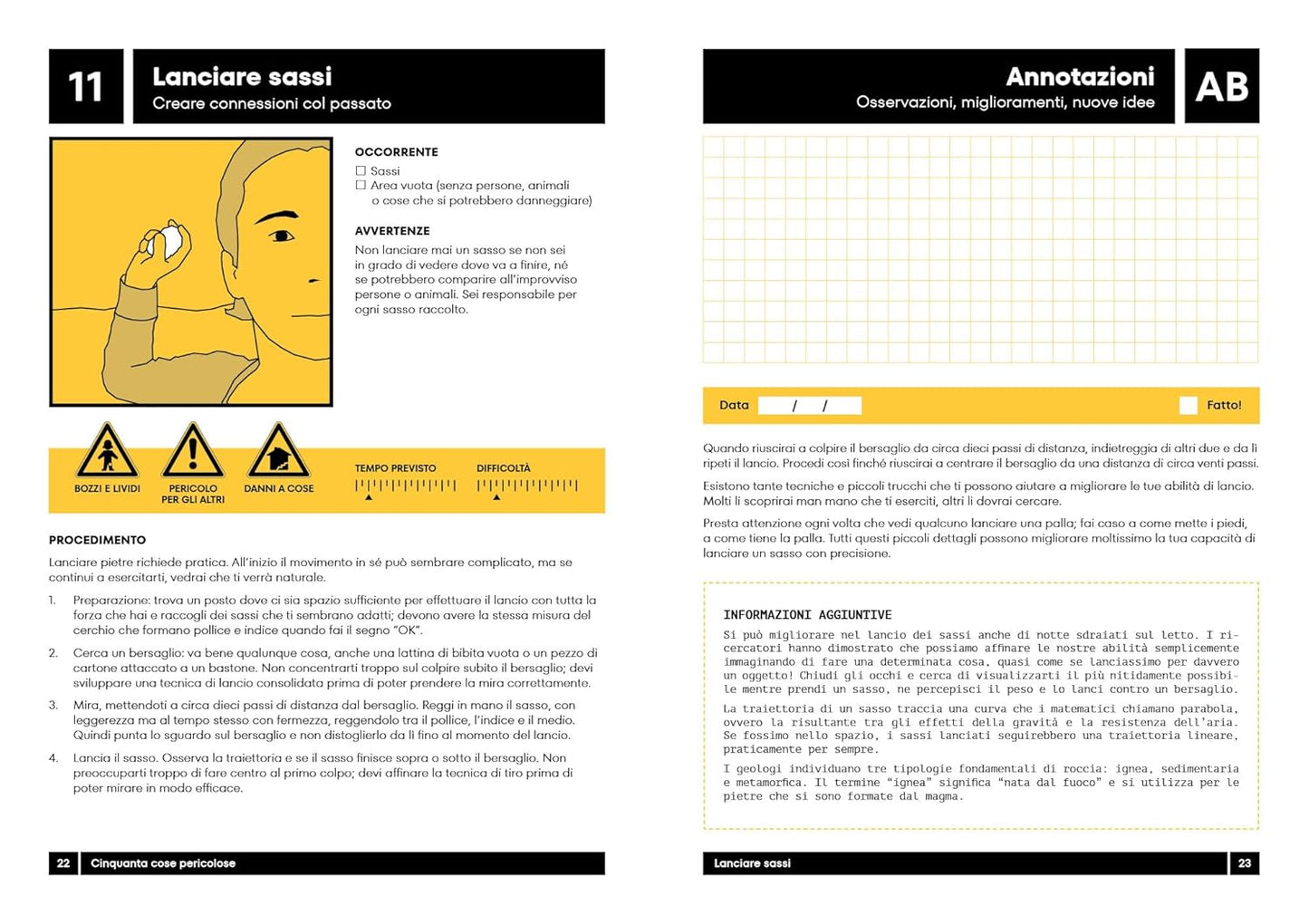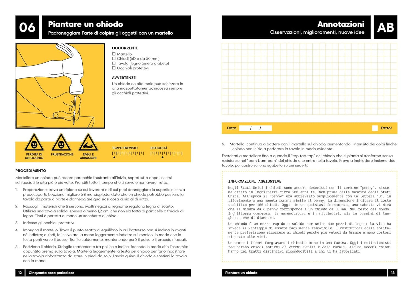 Il libro di attività perfetto per i genitori che vogliono aiutare i propri figli a cimentarsi con esperienze stimolanti, divertenti, formative… e anche un po' pericolose. In un'epoca in cui i bambini vengono troppo spesso tenuti al riparo da ogni rischio, l'autore di questo libro ricorda ai lettori che arrampicarsi sugli alberi è cibo per l'anima e che un coltellino tascabile non è un'arma. Con lo stesso entusiasmo con cui i bambini esplorano il mondo che li circonda, Gever Tulley spiega come si può "giocare con il fuoco" e "assaggiare l'elettricità" in tutta sicurezza. Le proposte includono: Attività, come camminare su una corda tesa. Abilità, come lanciare una lancia. Progetti, come fondere il vetro. Esperienze, come dormire nella natura selvaggia.