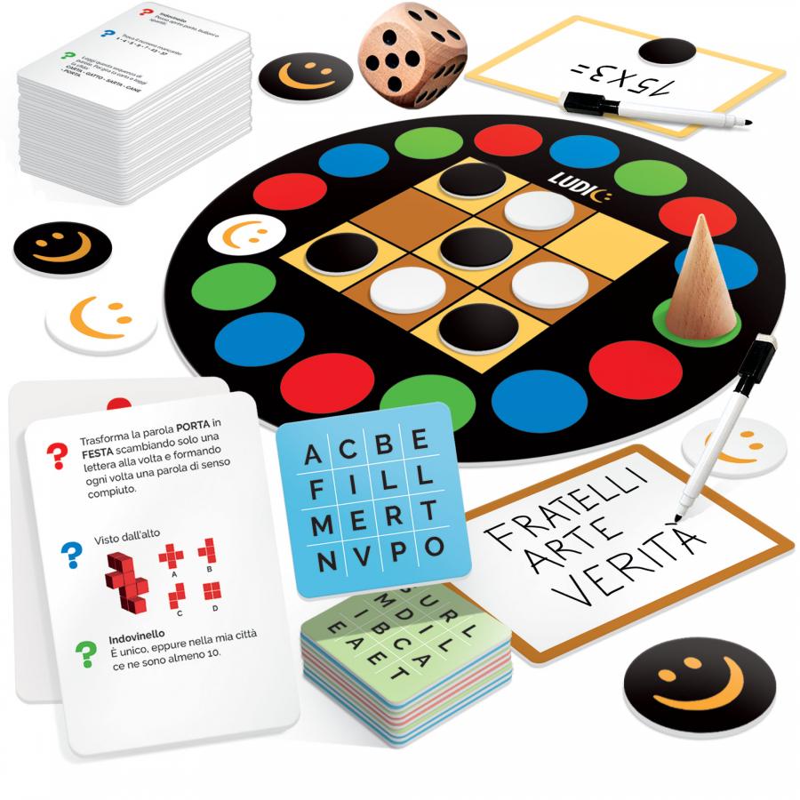 Contenuto: 200 maxi carte-sfida; 1 tabellone circolare; 10 gettoni bianchi e neri; 6 coccarde bianche e nere; 2 lavagnette; 1 dado; 1 pedone di legno; 20 tessere anagrammi; 2 pennarelli cancellabili; Regolamento