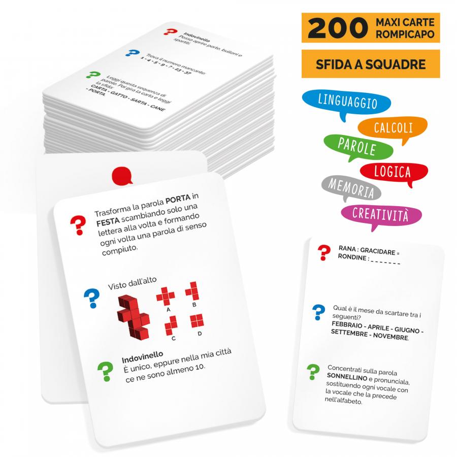 Formate due squadre, lanciate il dado e leggete sulle maxi carte una delle tantissime sfide, cercando di arrivare alla soluzione prima degli altri! Un grande gioco allenamente per tutti, con enigmi, rompicapi e prove di abilità che stimolano le intelligenze naturali: dal linguaggio alla logica, dalla creatività alla memoria.