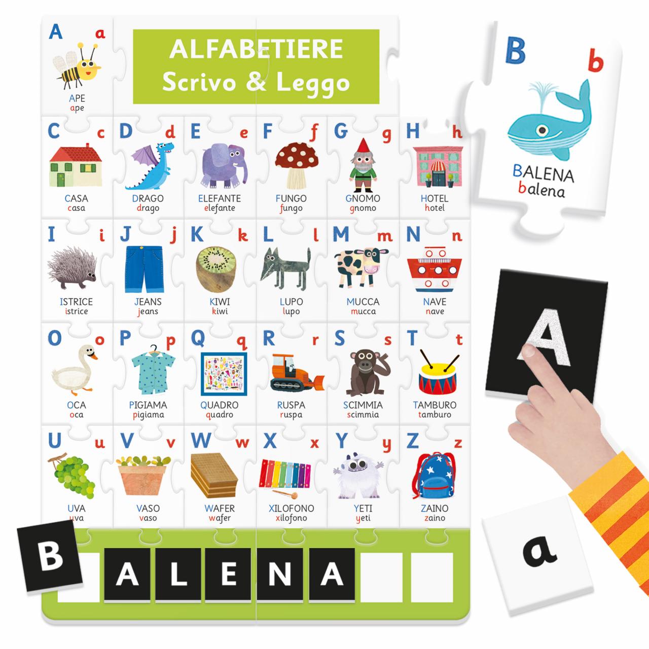 I bambini costruiscono il grande alfabetiere ed imparano a leggere lettere e parole. In più con le lettere mobili e tattili, formano le parole sul compositoio sia in maiuscolo che in minuscolo imparando a scrivere.