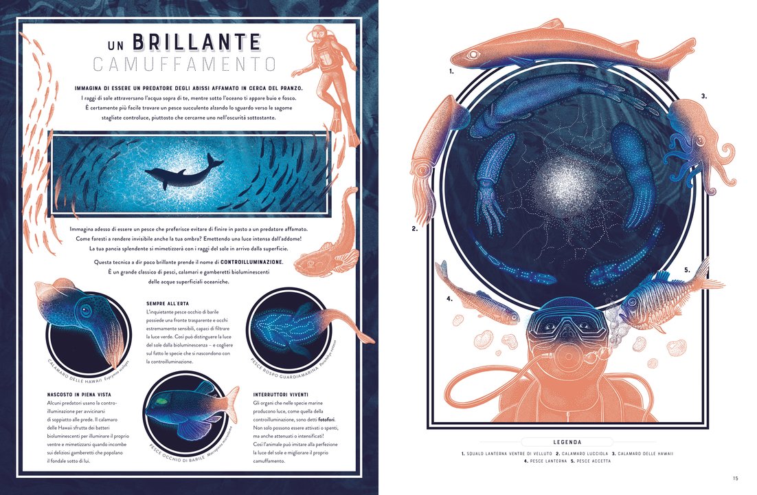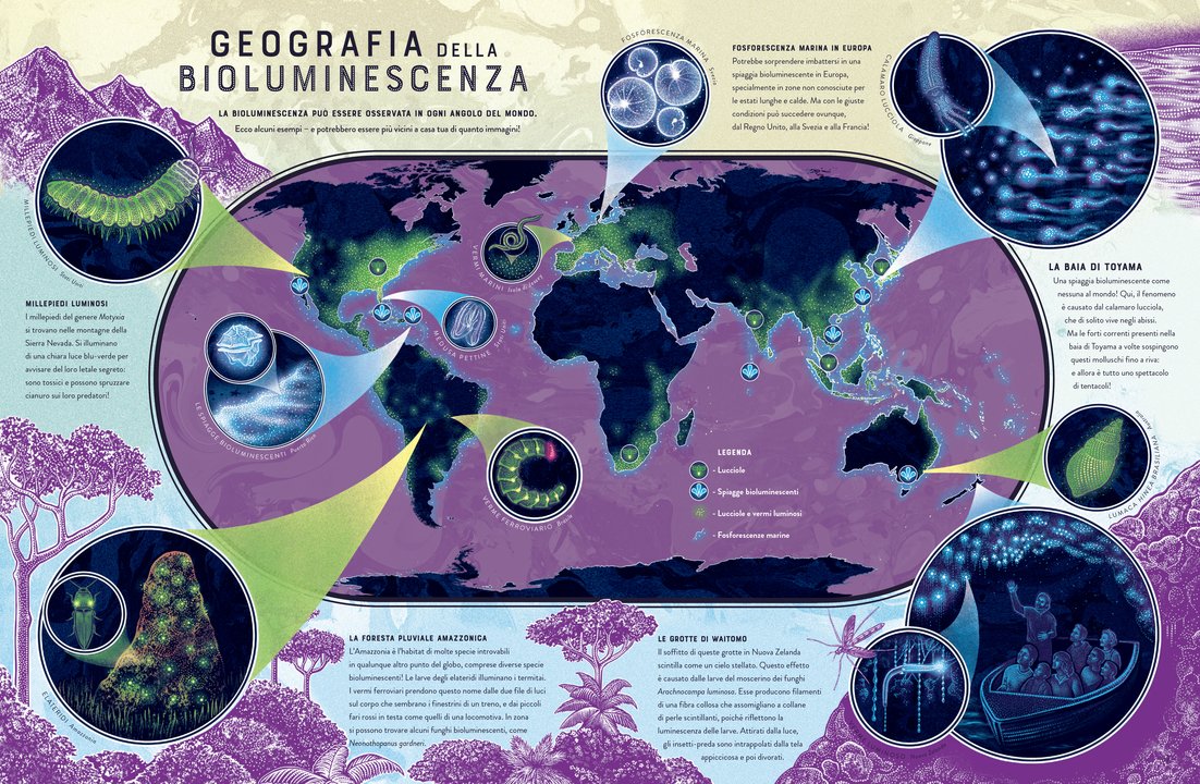 In un dialogo fra storia naturale e scienze pure, Bagliori analizza i meccanismi della bioluminescenza e ci espone cosa possiamo imparare da essa, ad esempio alcuni metodi per contrastare l’inquinamento e il cambiamento climatico. Prodotte mediante tecniche di stampa UV con l’aggiunta di un quinto colore Pantone, le illustrazioni brilleranno letteralmente sulla pagina, garantendo un’esperienza di lettura mozzafiato.