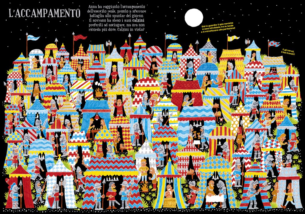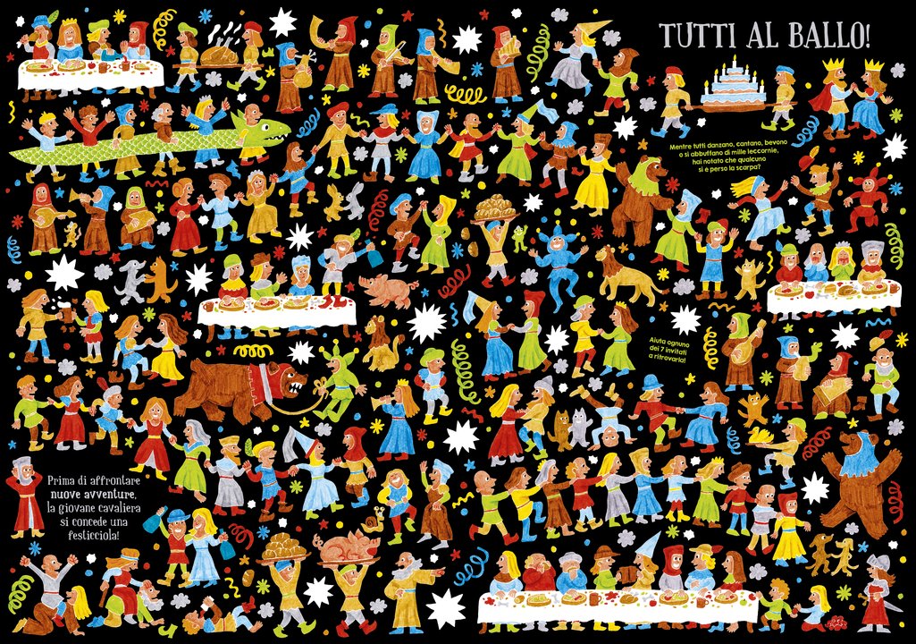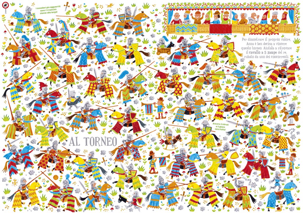 Un’intrepida donzella di nome Anna sogna di diventare cavaliera. Per riuscirci, dovrà affrontare dieci prove e ritrovare tutti gli oggetti preziosi rubati al re e alla regina. Come se non bastasse, avrà anche una trentina di intrusi da scovare… La seguono nell’avventura la lumaca Buffalmacca, Ubaldino il topolino e la rana Morgana. Ma siccome questi monelli preferiscono giocare a nascondino, toccherà al lettore aiutare Anna! Fra agguerrite battaglie, fitte foreste e draghi sputafuoco, un delizioso cerca e trova medievale ricco di dettagli divertenti.