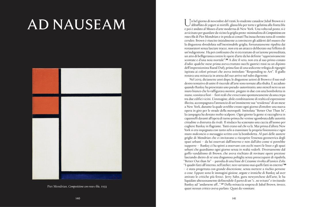 Dalle pitture rupestri agli spot painting di Damien Hirst, passando per gli autoritratti di Rubens e le ninfee di Monet, ecco la storia dell’arte secondo Banksy! A forza d’irriverenti installazioni urbane, parodie pittoriche e capolavori dissacrati, la superstar della street art ci offre uno sguardo inatteso sui grandi classici, dialogando con le tematiche attuali più scottanti e al contempo dando prova di una profonda conoscenza della tradizione artistica. Le oltre 40 opere rivisitate da Banksy e analizzate con finezza dal critico Kelly Grovier ci portano a ripensare il nostro rapporto con i capolavori fondanti della cultura e dell’estetica per dare un nuovo senso alla storia dell’arte.
