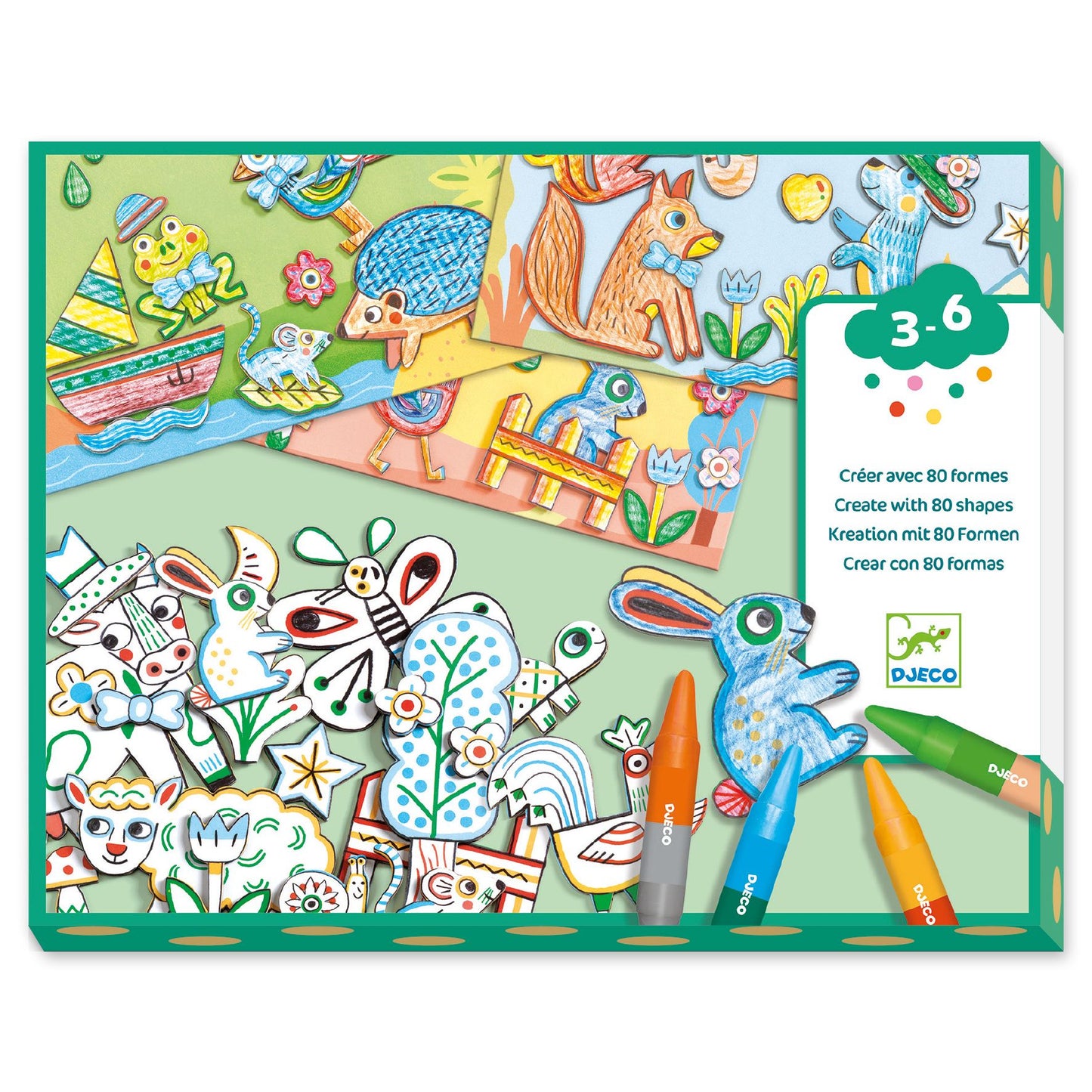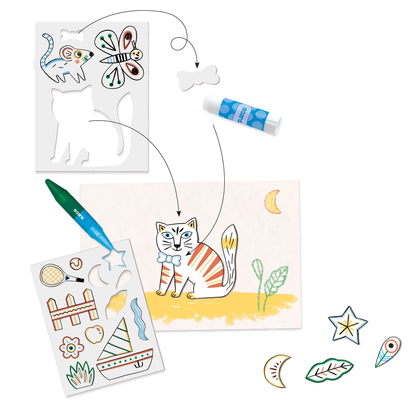 Una vasta gamma di forme e sfondi, oltre a colla e pastelli per aiutarti a creare quello che vuoi. Sfoglia il libretto per lasciarti ispirare