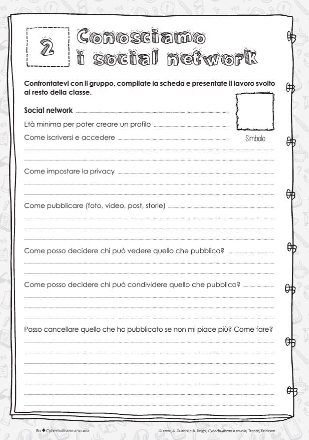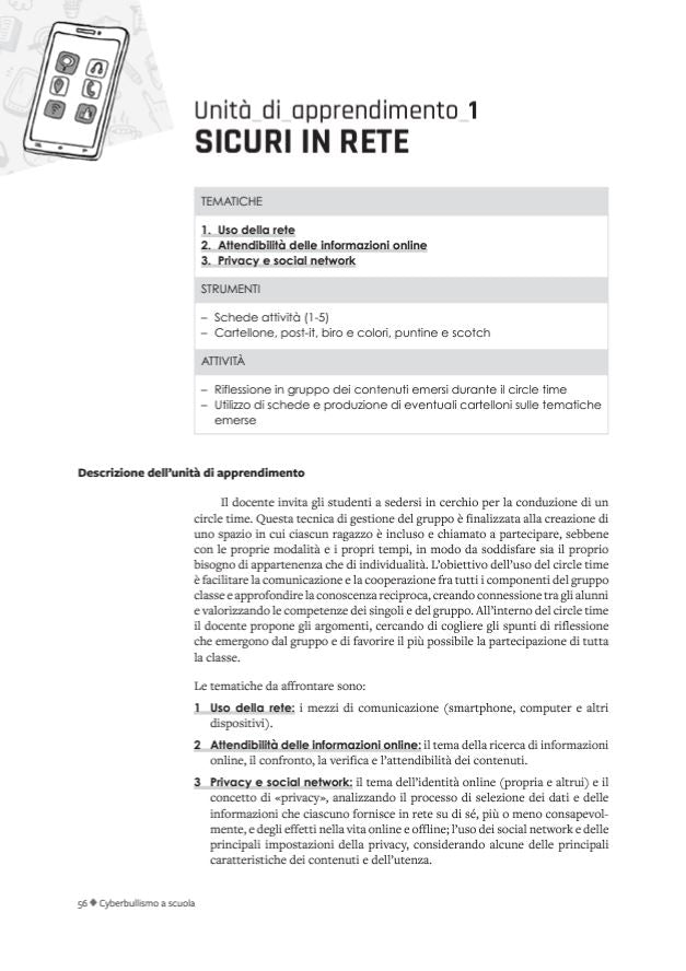 - Schede delle attività: partono da situazioni reali e hanno lo scopo di spingere i ragazzi a riflettere sul ruolo di tutti (non c’è solo vittima e bullo; ci sono anche spettatori e complici) e sulle strategie di coping (cosa fare per arginare le situazioni);