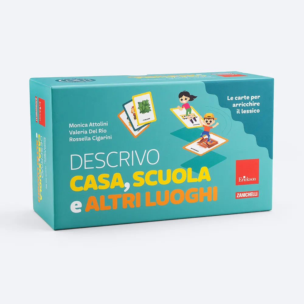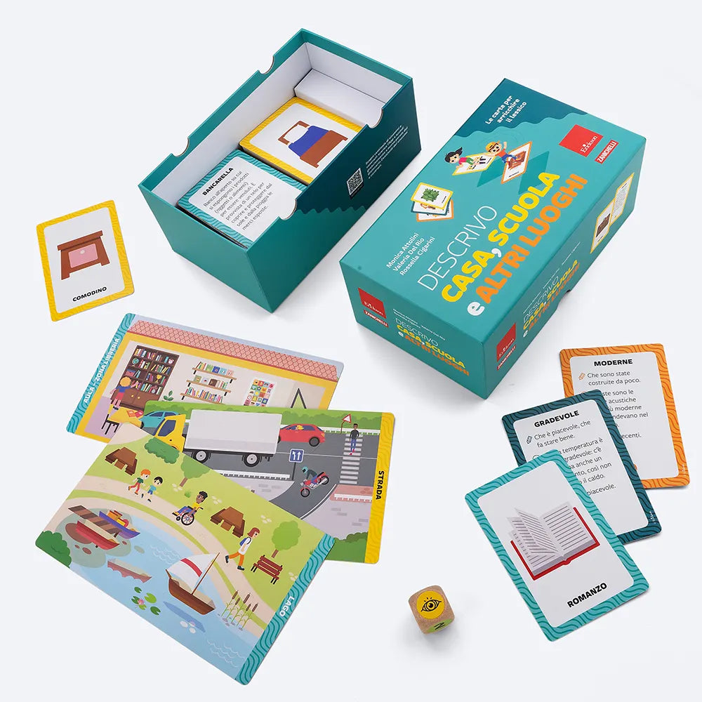 Il kit Descrivo casa, scuola e altri luoghi contiene 200 carte con nomi e aggettivi, corredate di descrizioni, esempi e sinonimi, 12 tavole con ambienti lessicali (cucina, camera, aula, libreria, parco, bosco, ecc.) e il dado dei 5 sensi che insegna ai più piccoli a osservare e descrivere dettagliatamente ciò che li circonda usando tutti i dati sensoriali.
