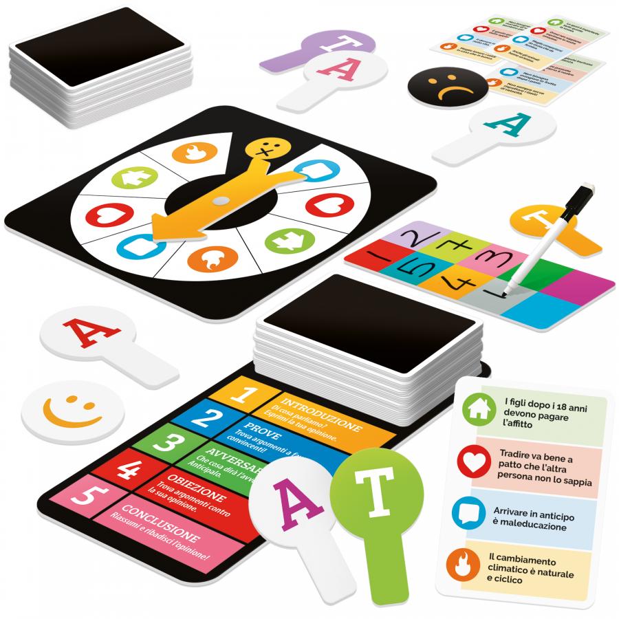 Contenuto: 110 carte con 440 Tesi-Antitesi; 1 plancia delle carte con struttura del discorso; 1 spinner; 1 gettone bianco (bonus); 2 gettoni neri (malus); 10 palette voto; 1 scheda segnapunti; 1 pennarello cancellabile; 1 astuccio portacarte; Regolamento
