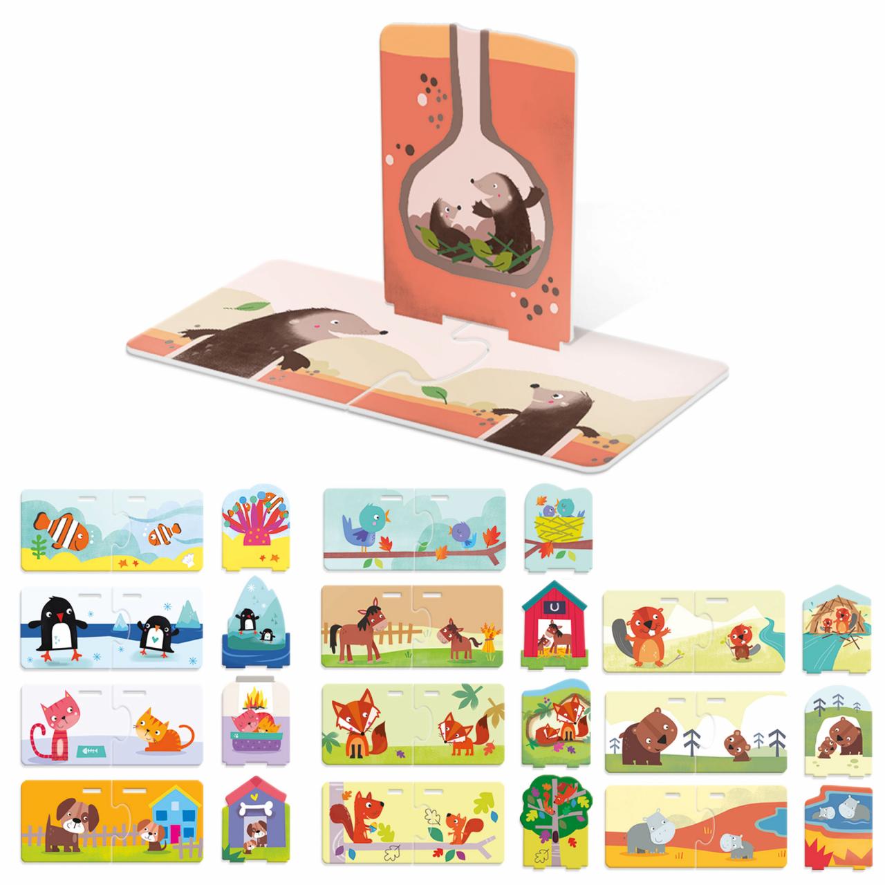 Dove vivono i castori? E qual è la casa di mamma cavallo e del suo puledrino? Ecco un gioco divertente che sviluppa il pensiero logico: i bambini prima associano i cuccioli ai propri genitori e poi, grazie agli incastri verticali, scoprono dove vivono e dove si riparano gli animali.