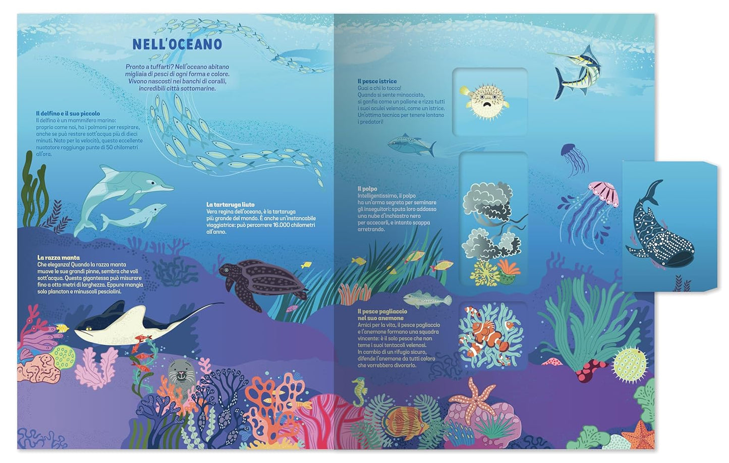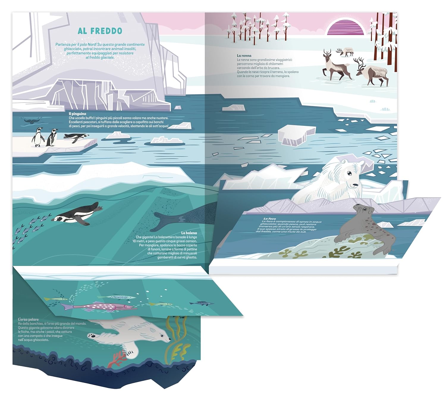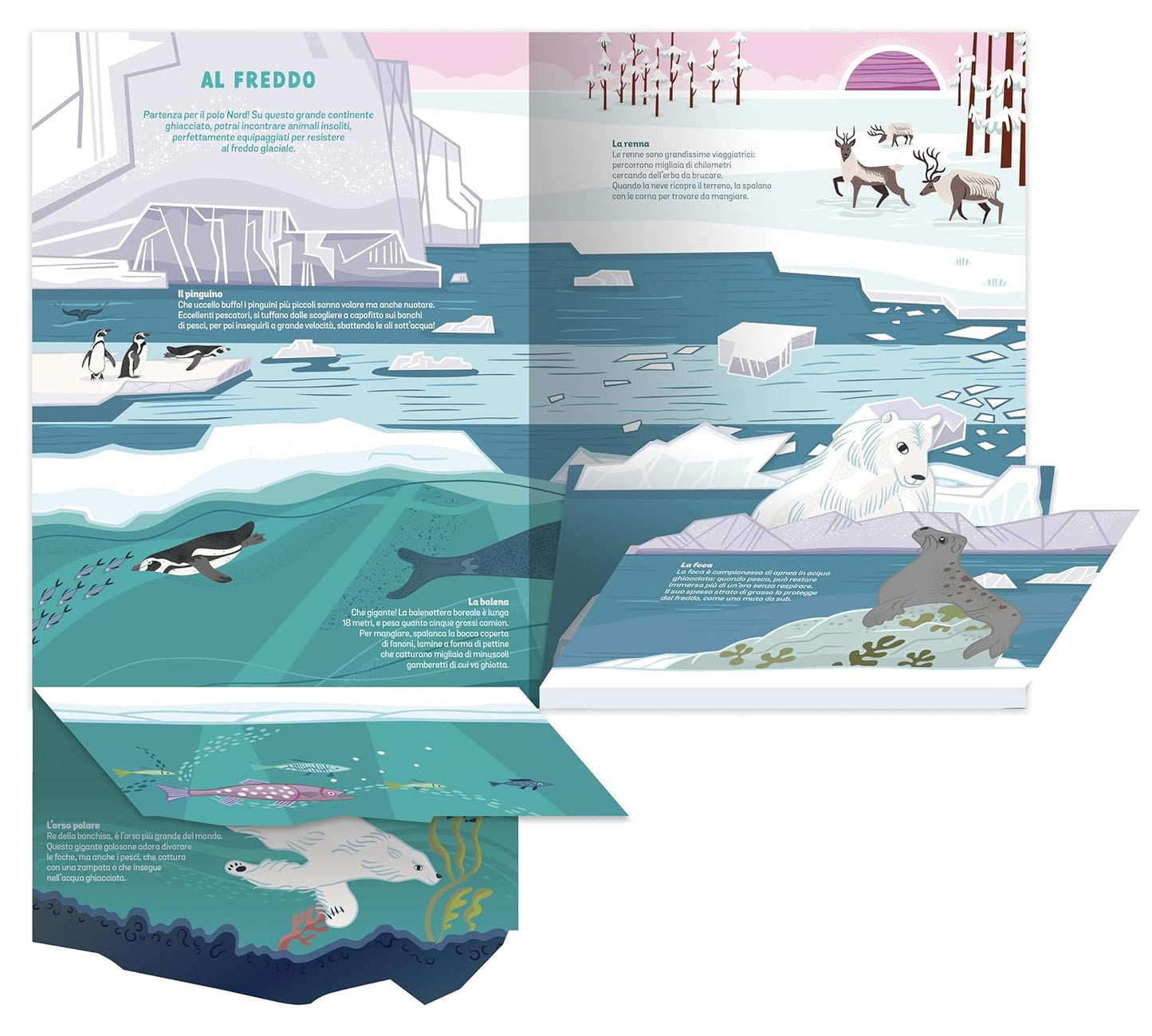Un meraviglioso libro di divulgazione pop-up per conoscere gli animali del mondo. Dal leone della savana all’orso del Polo Nord, dal giaguaro dell’Amazzonia alle creature marine, immergiti nell’universo affascinante degli animali selvatici del nostro pianeta! Apri i pop-up, tira le linguette, solleva le finestrelle, muovi gli animali… 20 tra animazioni e pop-up per scoprire gli animali divertendoti! Le scoperte animate. Un libro di divulgazione elegante e meraviglioso. 20 tra animazioni e pop-up di grande effetto e qualità. Spiegazioni semplici e dettagli curiosi per ogni animale descritto all’interno del suo habitat. Illustrazioni incredibili firmate Paula McGloin.