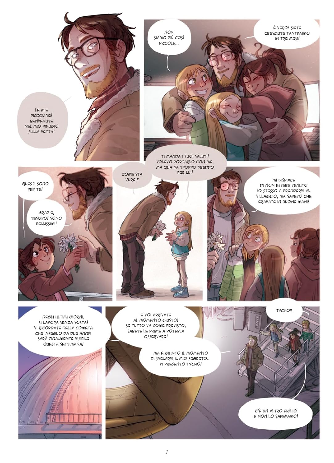 Sarah, Cassiopée e Lucille intraprendono un viaggio avventuroso verso le maestose Alpi francesi, una meraviglia naturale che si fonde armoniosamente con la maestosità della natura. Il loro obiettivo èl'osservatorio astronomico, un luogo affascinante dove lavora un importantissimo astronomo, la cui dedizione è così profonda da assorbire completamente. Quest'uomo è nientemeno che Philippe Grémillet, il padre delle nostre protagoniste! Philippe, immerso nei suoi studi, attende con ansia l'arrivo della cometa, che aspetta di studiare da tutta la vita. Ma le sue adorate figlie arrivano proprio nel momento cruciale in cui il firmamento promette uno spettacolo celestiale senza pari. Come reagiranno le tre sorelle dinanzi a questo padre così immerso nel suo mondo? Mentre si avvicinano alla loro meta, si apre di fronte a loro un mondo affascinante, colmo di stelle, pianeti e segreti cosmici...