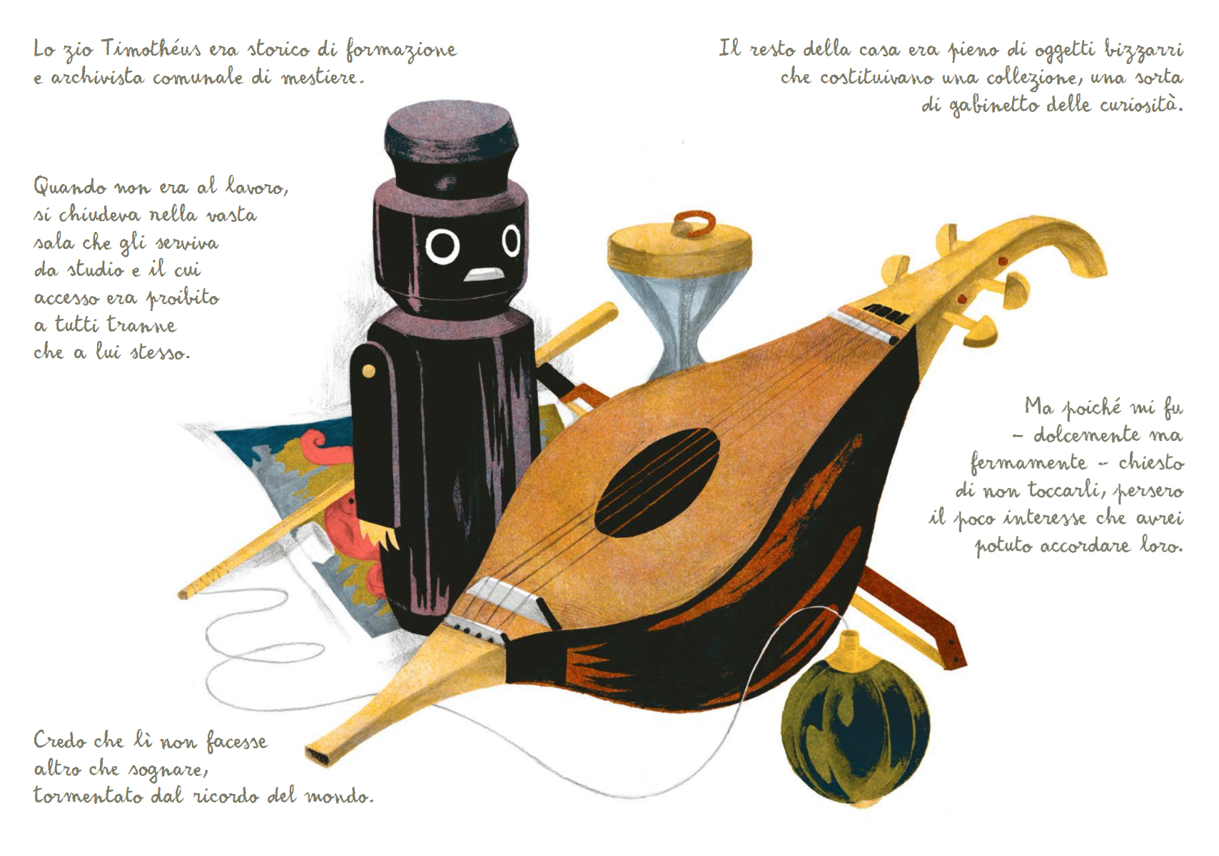 Durante l’estate dallo zio Timothéus, uomo pacioso, Hyéronimus si annoia. Gironzolando per la città, è fatto prigioniero dai pirati! Entra a far parte della ciurma: un gatto, una bambina mascherata e il terribile capitano Brett. Con loro, vive avventure folli, quelle che ogni bambino sognerebbe per sé. In un via vai molto emozionante, scoprirà che il tesoro dei pirati è fatto di giocattoli, ma soprattutto capirà che non sempre chi è all’apparenza cattivo, come Brett, va considerato tale fino in fondo, e, invece, chi si professa uomo dabbene, come Timothéus, da bambino non fu proprio pacifico. La morale è: tutti, da piccoli, avrebbero meritato di far parte della ciurma del più grande pirata di sempre: perché l’infanzia è ribelle, inquieta, anarchica, avventurosa e, soprattutto, si vive una volta sola.