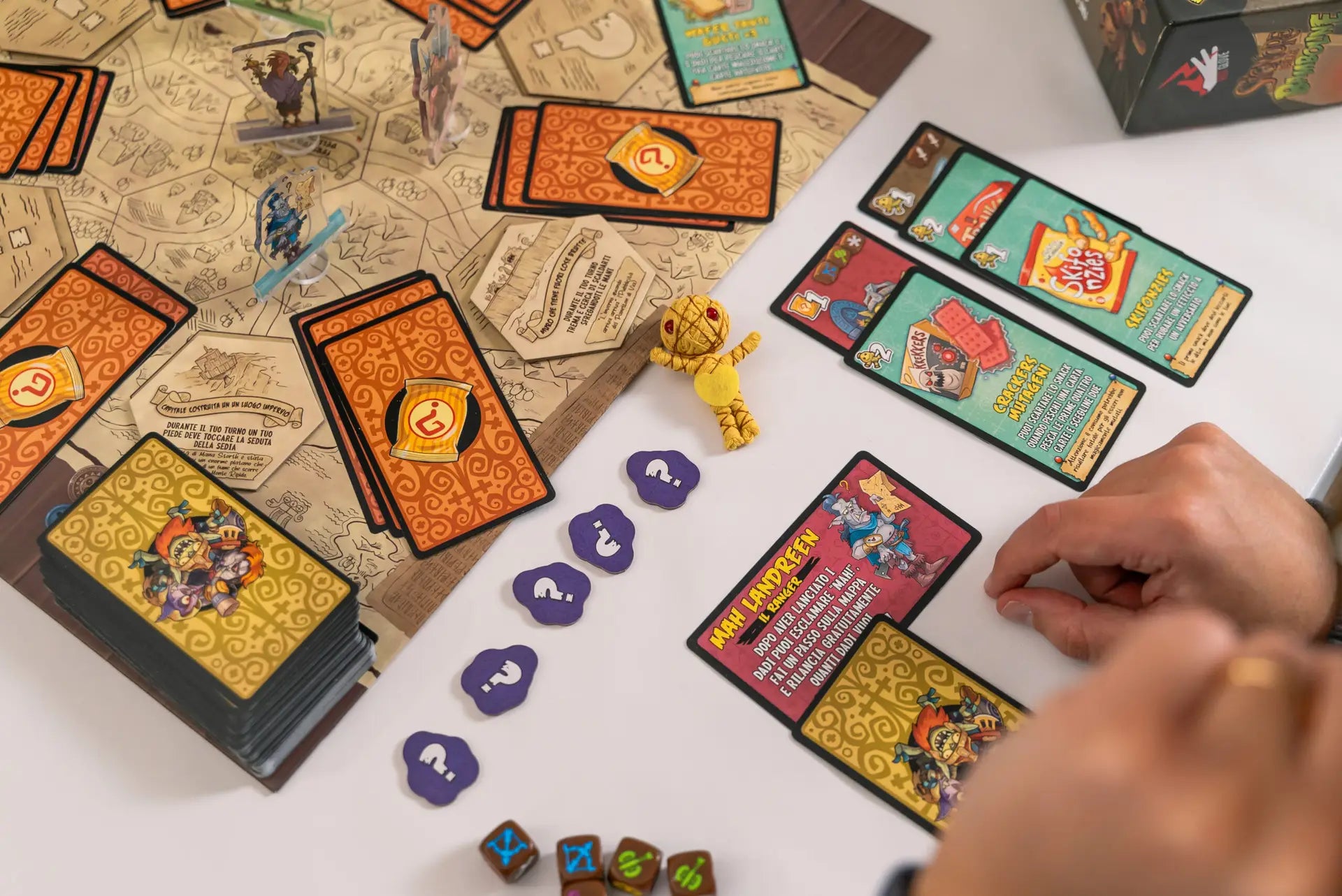 Contenuto: 5 Dadi, 1 Bambolina Vudù Dorata, 1 Sacchetto, 1 Mappa della “Terra di Tre Quarti”, 6 Stand Up, 14 Tessere Luogo, 132 Carte (29 Artefatto, 24 Snack, 73 Maledizioni, 6 Personaggi), 30 Tessere Feticci, Regolamento.