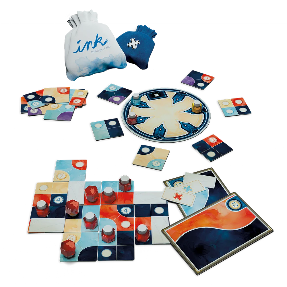 Contenuto: 5 Tessere di partenza, 95 Tessere Inchiostro, 100 Bottigliette d’inchiostro colorato, 15 Bottigliette d’inchiostro nero, 10 Carte Tavolozza, 1 Ruota Pennino, 1 Plancia Azione Bonus, 15 Segnalini X, 20 Segnalini XX, 12 Tessere Azione Bonus, 1 Sacchetto tessere Inchiostro, 1 Sacchetto segnalini X, 8 dischetti per giocatori daltonici, 1 segnalino Pennino Primo Giocatore, 1 Regolamento, 1 Regolamento modalità in solitario, 1 Scheda di consultazione Azioni Bonus, 16 segnalini Numero Obiettivo, 20 Quadrati colorati