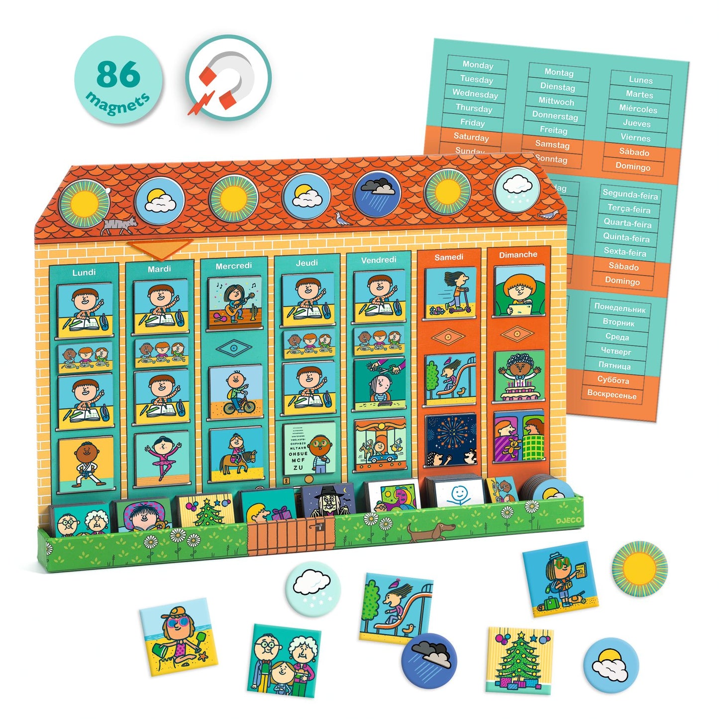 - Un numero elevato di magneti: scene della vita quotidiana, attività sportive o artistiche, eventi ricorrenti o eccezionali, meteo, ecc. da posizionare all’infinito sul tabellone magnetico.