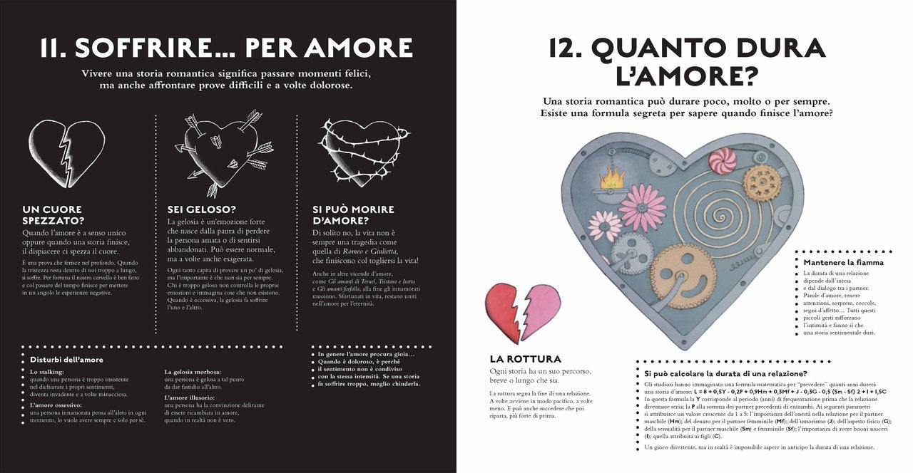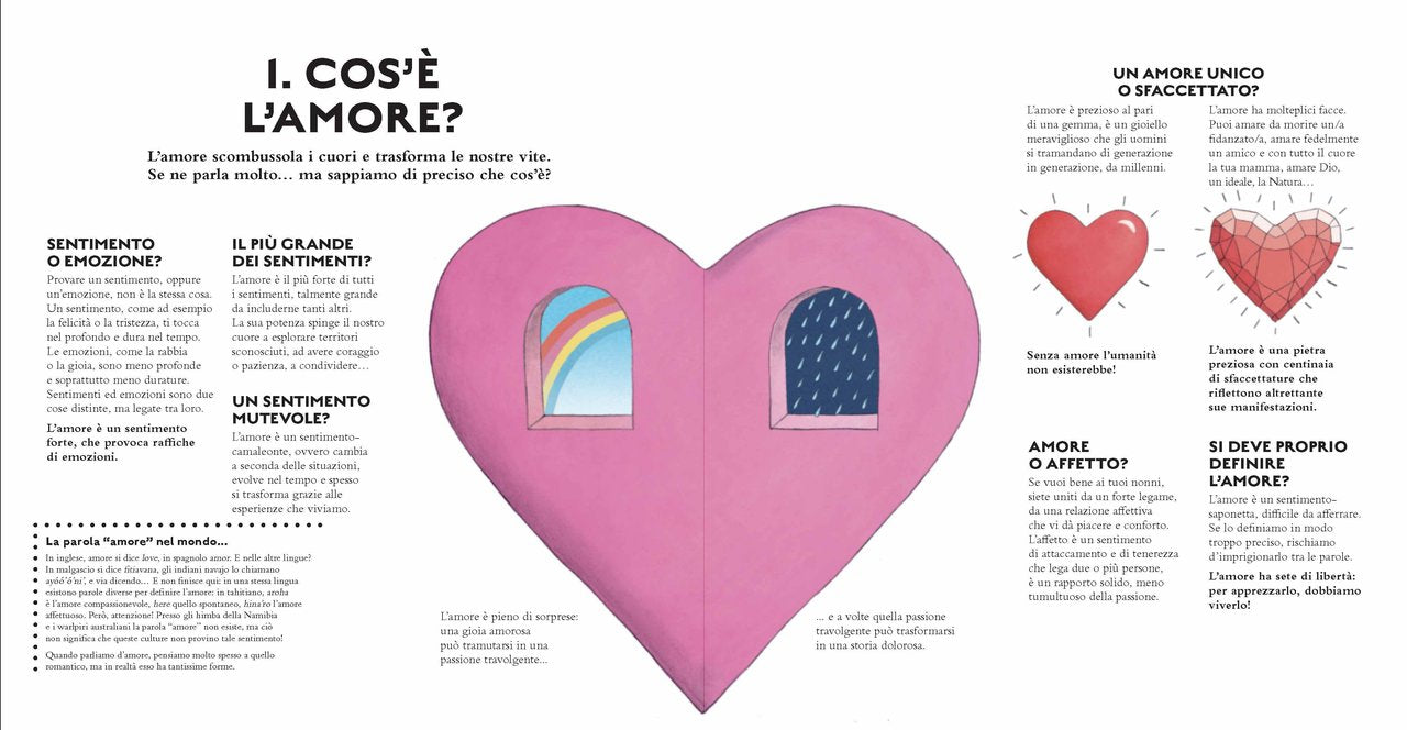 1000 sfaccettature, anzi 1001! Dopo aver esplorato le terre e gli universi immaginati, lo scorrere del tempo e le meraviglie della vita, Guillaume Duprat affronta un altro grande tema con cui da sempre l’umanità si è trovata a fare i conti: l’amore. Lo fa ponendosi anzitutto delle domande cruciali: a cosa serve e da dove viene? Davvero ci rende ciechi? In che forme si manifesta? E cos’è un’emozione? L’indagine prosegue poi scandagliando miti, storie, ricorrenze di tutto il mondo e di tutte le culture. Non mancano momenti interattivi, dove i giovani lettori sono chiamati a dire la loro scrivendo una pagina di diario o reagendo ad alcuni spunti di riflessione: cosa cerchi nella persona da amare? Che cosa fai per dimostrare amore agli altri? Pensi che l’amore possa cambiare nel tempo? Un libro vivace e coinvolgente per mettere a fuoco il sentimento che forse più di tutti governa la vita umana.