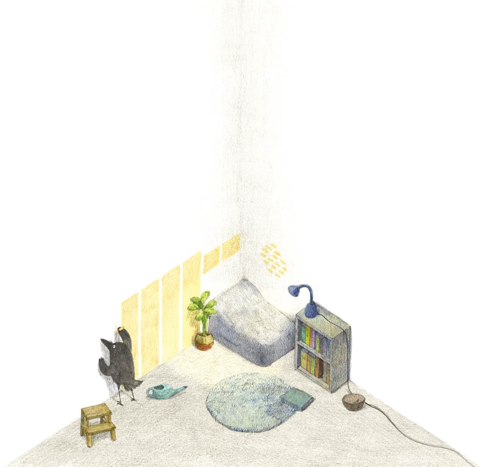 Che bello avere un angolino per sé! Un luogo caldo e sicuro, con tutto ciò che serve per stare bene. È il sogno del piccolo corvo che abita tra le pagine di questo libro. Nel suo angolo mette prima un letto, poi una pianta, una libreria, i suoi disegni. Sembra perfetto, ma... forse manca qualcosa? Dall’illustratrice coreana Zo-O, un albo (quasi) senza parole delicato e giocoso.