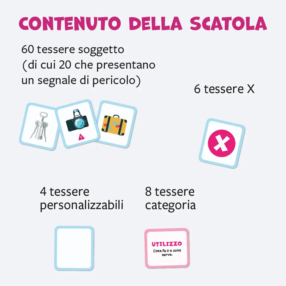 Si prepara una griglia 6x6 con 30 tessere soggetto e 6 tessere “X”. A turno, ogni giocatore scopre fino a 5 tessere, cercando di trovare una caratteristica in comune tra quelle visibili. Se riesce, guadagna le tessere che rientrano nella categoria scelta. Ma se scopre una tessera “X” e insieme appare anche un segnale di pericolo, perde il turno e rischia di perdere tutto.