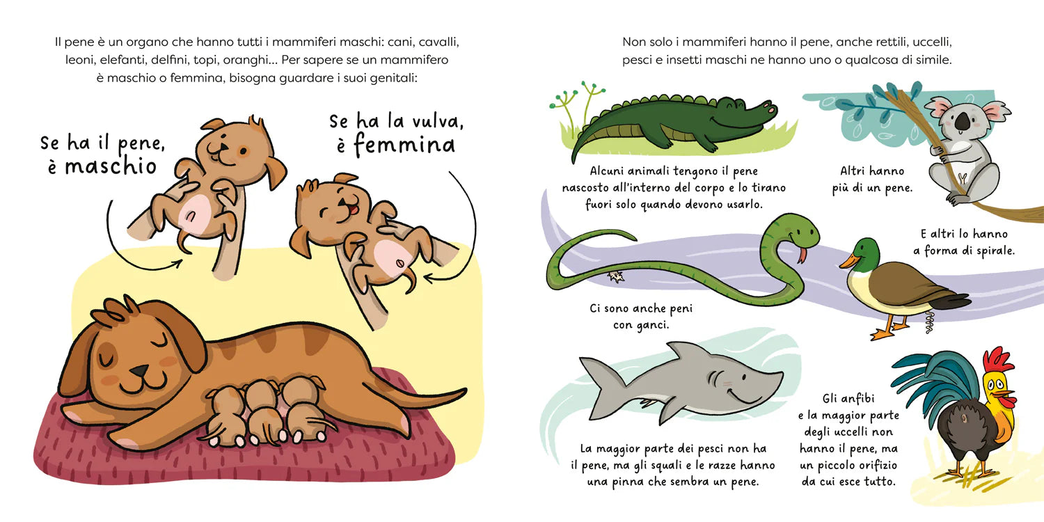 Una coppia di albi illustrati gemelli che raccontano con parole semplici e illustrazioni tenere e gentili l’anatomia e la fisiologia dell’apparato riproduttore per parlare anche di affettività, sentimenti e relazioni e insegnare ai bambini a non essere imbarazzati del proprio corpo, ma a viverlo con naturalezza e senza tabù. Si parla anche di erezione, mestruazioni, concepimento, di come prendersi cura dei propri genitali e, infine, anche del tema del consenso. In fondo al libro l’autrice, una psicologa specializzata in educazione sessuale, si rivolge agli adulti per dare consigli e suggerimenti su come leggere il libro assieme ai bambini e alle bambine e rispondere alle principali preoccupazioni e domande che le vengono poste durante i suoi incontri con genitori ed educatori.