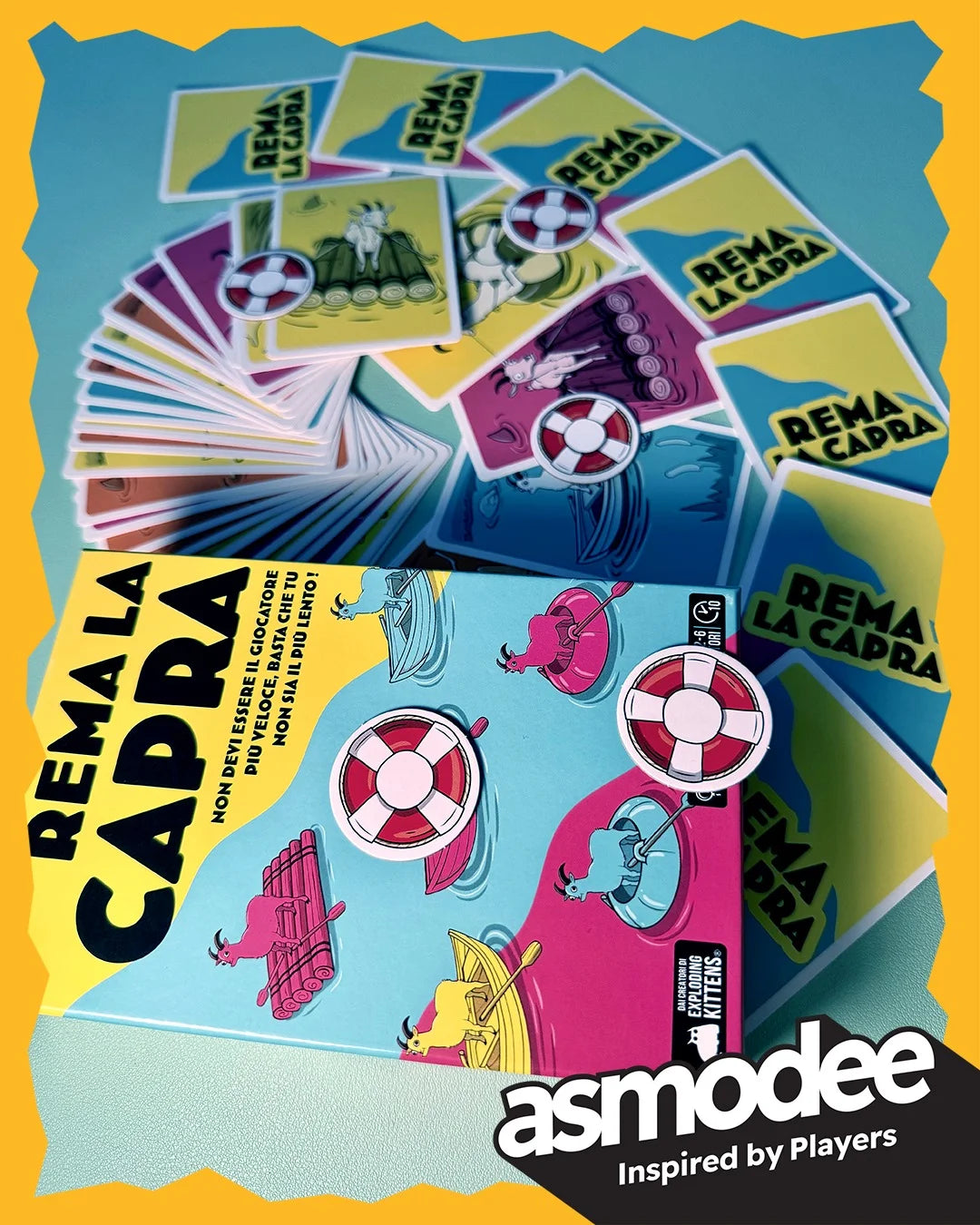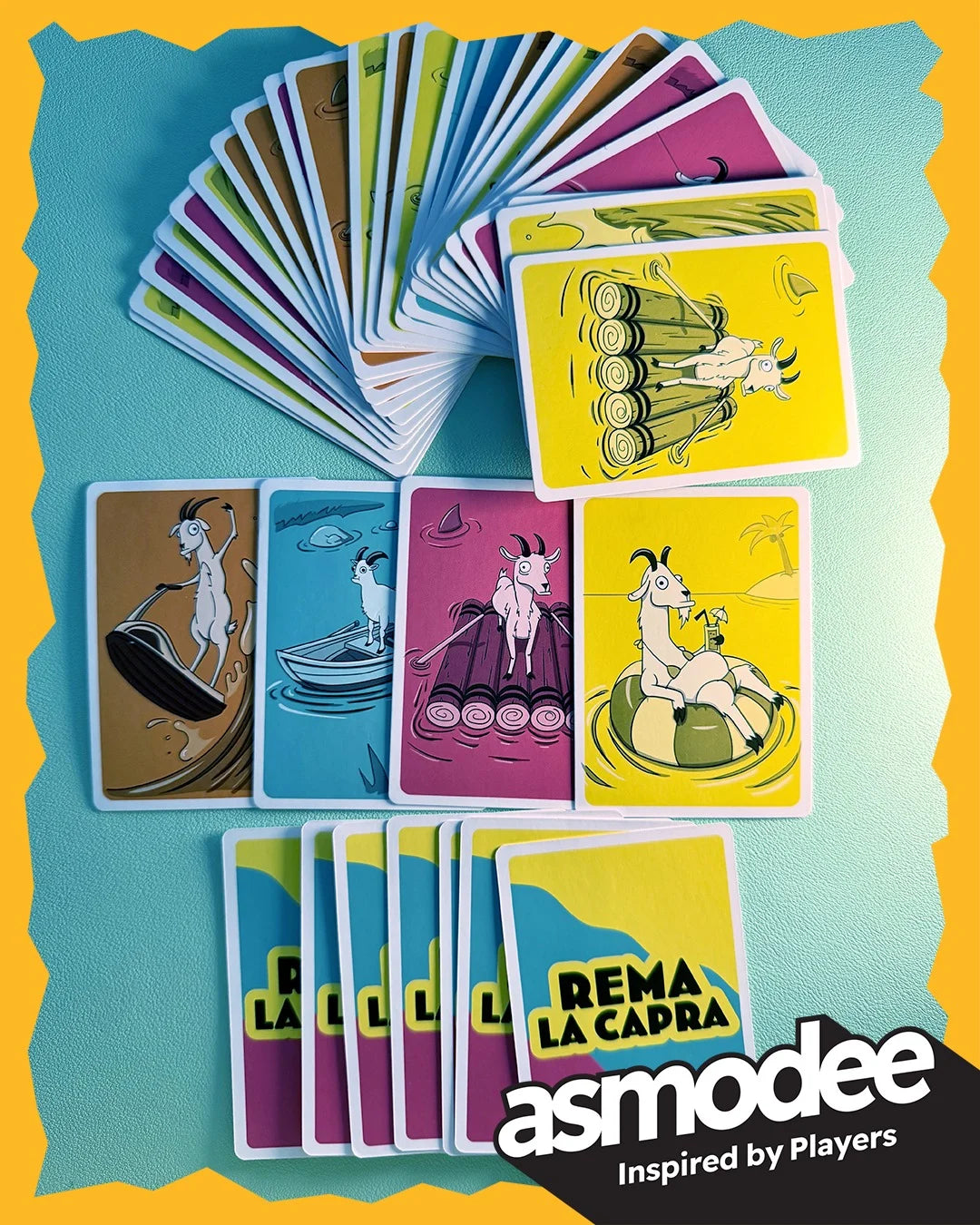 Un party game di occhio e velocità! Giocate a turno le vostre Carte Capra in una griglia 3×3 disposta sul tavolo. Se individuate un Set di 3 carte uguali (per colore o imbarcazione), afferrate un Salvagente. Ma attenzione! Non ci sono Salvagenti a sufficienza per tutti, e se sarete il giocatore più lento affogherete nelle carte!
