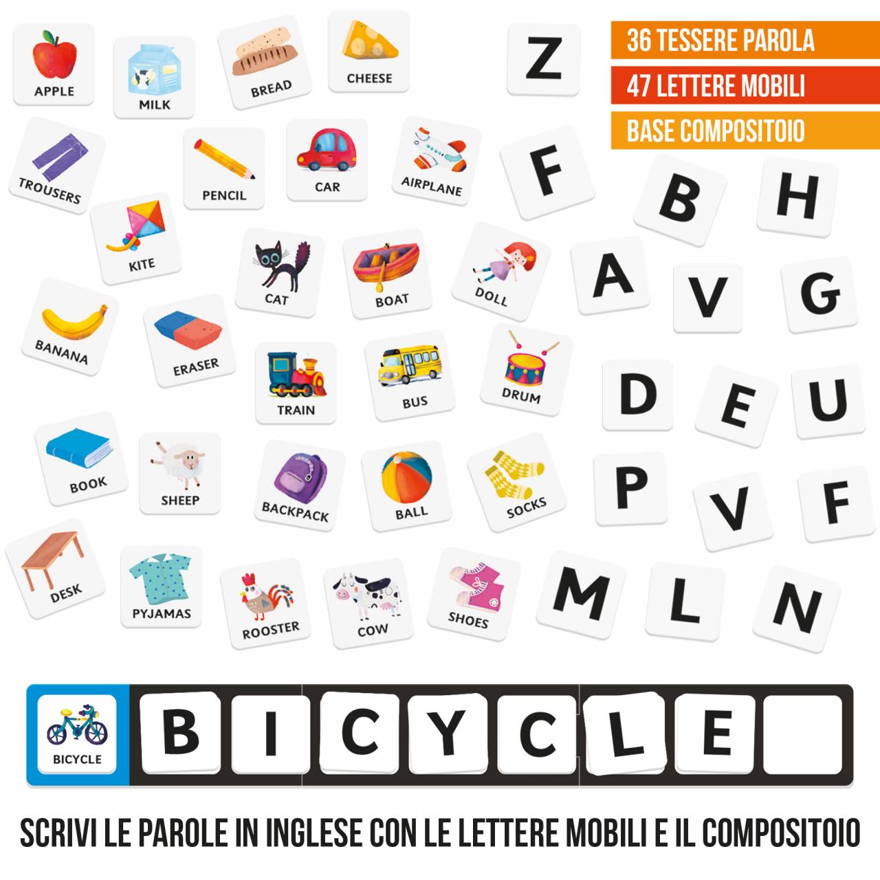 Contenuto: Base-compositoio; 36 tessere parola; 47 lettere mobili; 1 tessera Qr code per scaricare l’App collegata al gioco; Istruzioni
