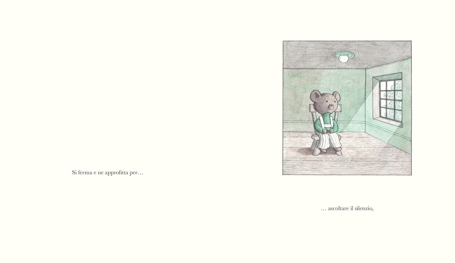 Con il suo maglione verde a collo alto e la sua salopette a righe, l’orsetto esce di casa e, tutto solo, prende il viottolo segreto e passeggia tra gli alberi, canticchia e si guarda intorno. Di nuovo a casa, tutto solo assapora il silenzio, il rumore della pioggia e, passato il temporale, corre di nuovo fuori con il suo aquilone. Tutto solo, si sdraia nell’erba, o va in città a guardare le vetrine, oppure si gode il freddo della neve oppure il caldo davanti al camino o ancora, a notte fonda, si mette sotto le coperte nel proprio letto con un bel libro in mano prima di prender sonno: questi sono i suoi momenti preferiti in cui è proprio bello e necessario stare solo con sé stesso.